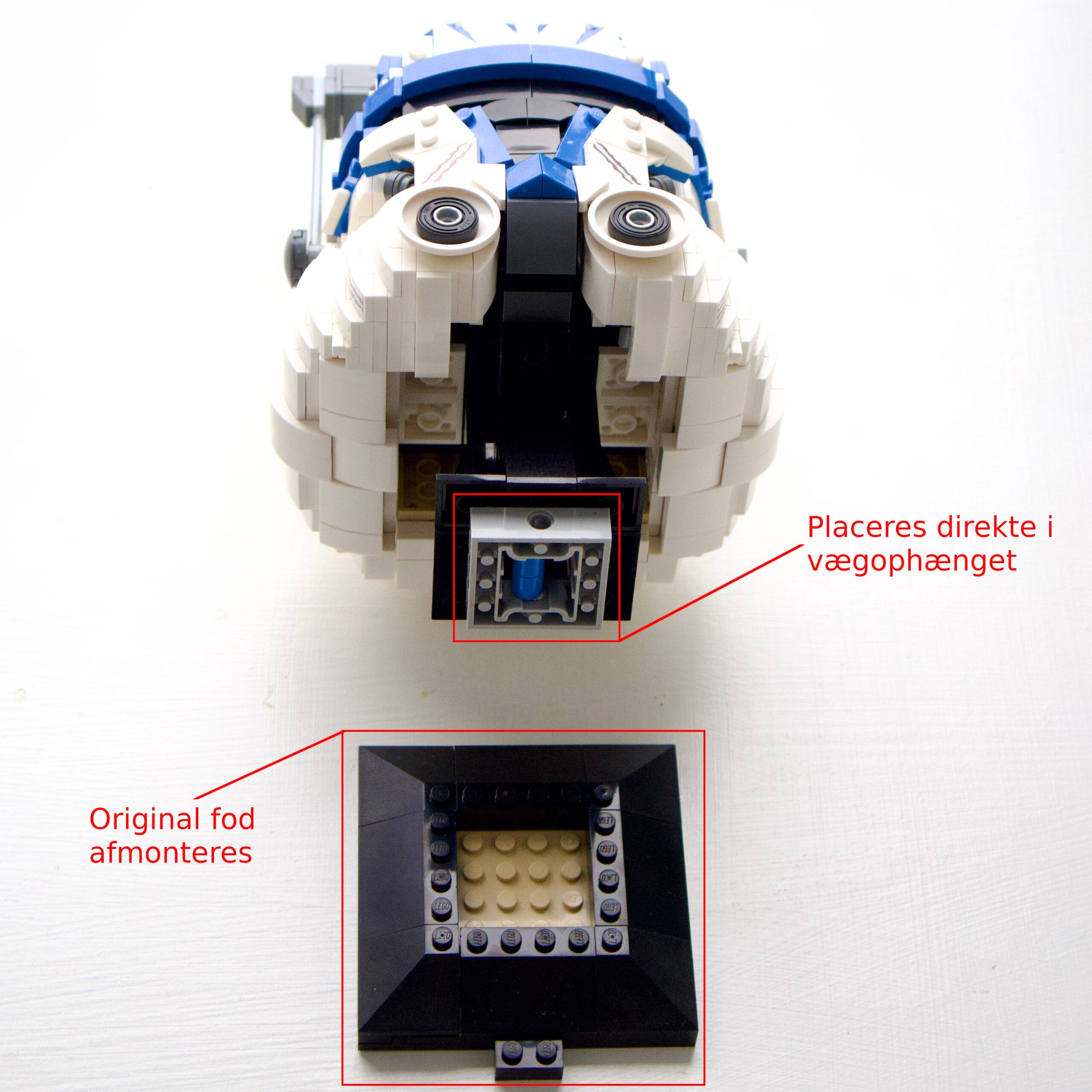 For at montere hjelmen korrekt skal den originale fod/bund fra LEGO fjernes, som vist på produktbillederne.